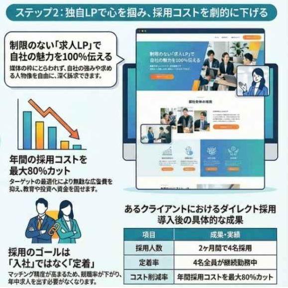 いろいろと試行錯誤を重ねた末に編み出したのが「ダイレクト求人採用法」です。